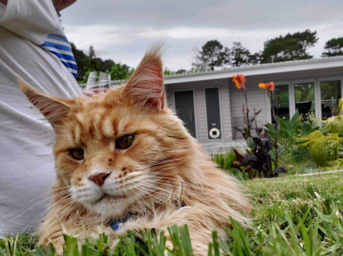 I am currently in the UK. I am however fortunate enough to receive small food parcels of sanity from home. Here is Lord Viking being adorable in the freshly mown grass of 15-degrees-warmer-than-here, just North of Auckland.