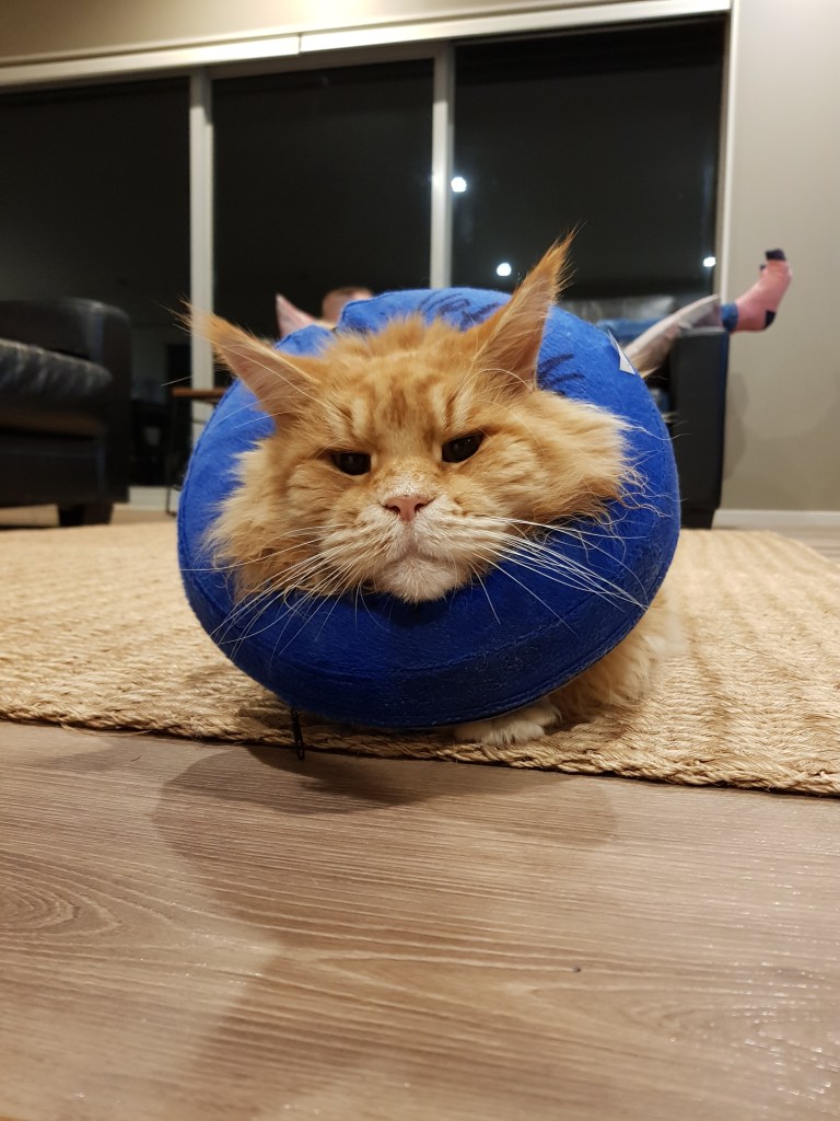 Poor Lord Viking has some ear issues and had to have a biopsy today. He doesn’t travel well in cars and to top it all he now has to wear a Donut Of Shame for a couple of days. To say he is not impressed is obvious from his poor little face.
